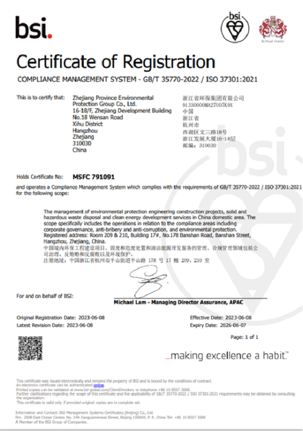 喜訊!浙江省環(huán)保集團成為國內(nèi)首個通過ISO 37301合規(guī)管理體系認證的環(huán)保集團
