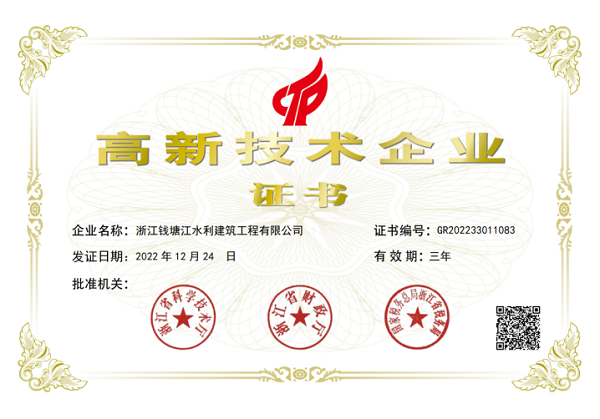 喜報!浙錢水建正式榮獲“國家高新技術企業”稱號